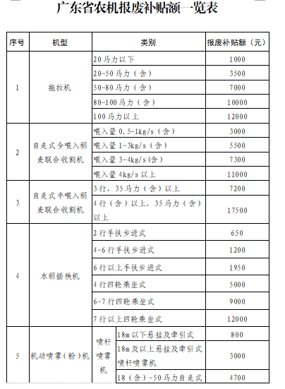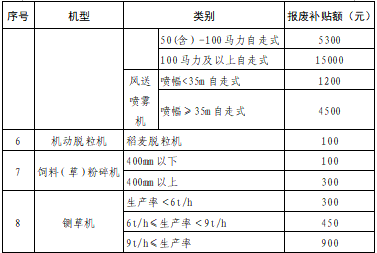 《通知》规定,补贴对象为从事农业生产的个人和农业生产经营组织,农业生产经营组织包括农村集体经济组织、农民专业合作经济组织、农业企业和其他从事农业生产经营的组织。报废补贴农机种类为拖拉机、联合收割机、水稻插秧机、机动喷雾(粉)机、机动脱粒机、饲料(草)粉碎机、铡草机等7类,根据不同的类别报废补贴100到17500元不等。